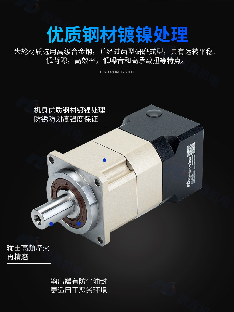 行星架与出力轴一体成型,前端轴承直接置于行星固定架内,且前后轴承为大跨距设计,可达到较大的同心精度和钢性。齿轮材质选用高级合金钢,并经过齿型研磨成型,低背隙,高效率,低噪音。行星轮的传动介面采用高强度滚针轴承,满针排列不含保持架,以达到较大接触面积较小间隙公差,从结构上保证精度较大钢性。